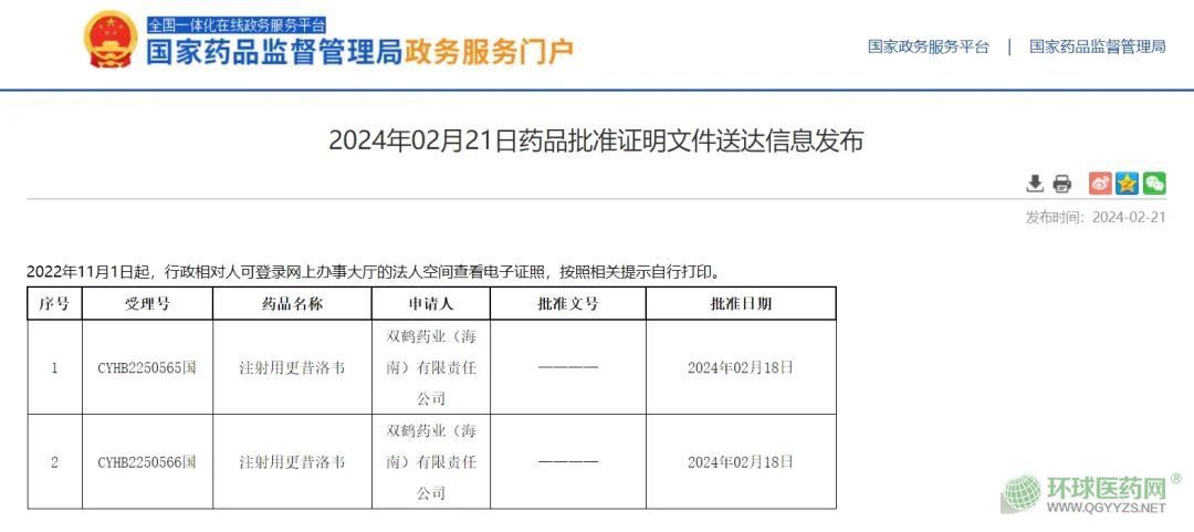 - 2024年2月21日,國家藥監(jiān)局官網(wǎng)發(fā)布最新藥品批準證明文件。本次僅雙鶴藥業(yè)的注射用更昔洛韋藥品補充申請獲批,通過一致性評價。 注