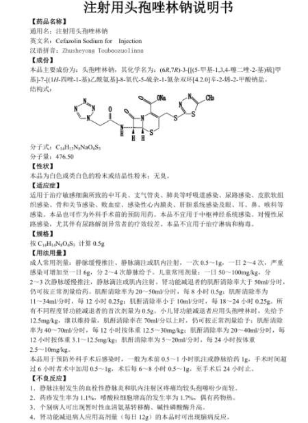 - 本頁面信息僅供參考,請以產(chǎn)品實際附帶說明書為準(zhǔn)。 華北制藥 注射用頭孢唑林鈉 說明書文字版 詳情見下圖 華北制藥 注射用頭孢唑