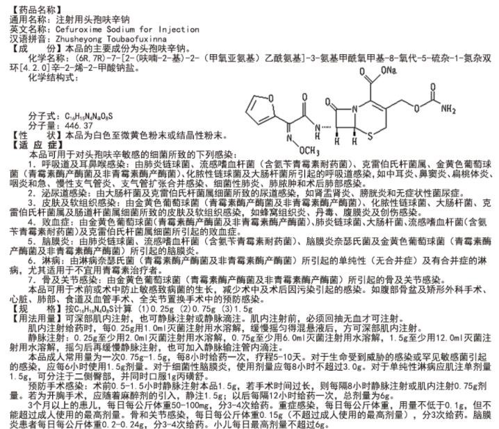 - 本頁(yè)面信息僅供參考,請(qǐng)以產(chǎn)品實(shí)際附帶說(shuō)明書(shū)為準(zhǔn)。 山東羅欣 注射用頭孢呋辛鈉 說(shuō)明書(shū)圖片版 山東羅欣 注射