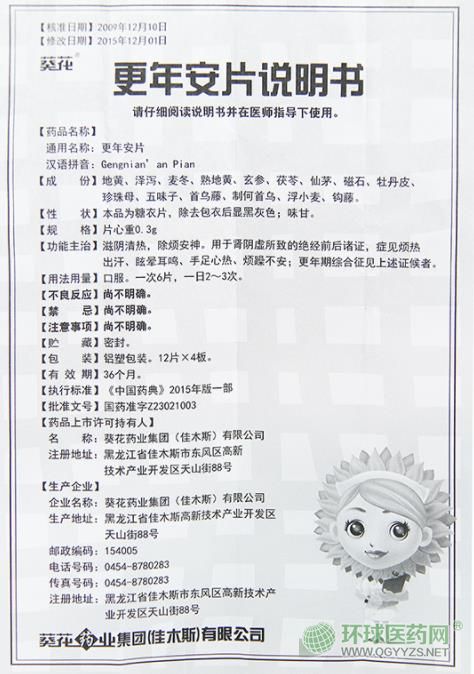 - 本頁面信息僅供參考,請(qǐng)以產(chǎn)品實(shí)際附帶說明書為準(zhǔn)。 更年安片執(zhí)行標(biāo)準(zhǔn):中國藥典2015年版一部。 葵花牌 更年安片 外包裝