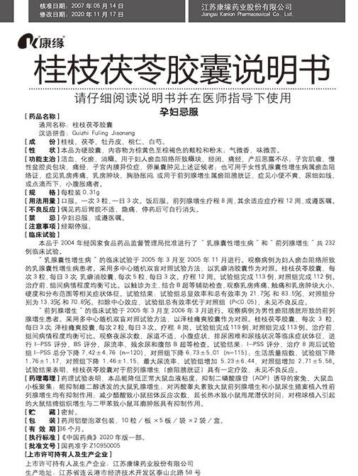 中成藥、處方藥、醫(yī)保甲類;钛、化瘀。用于婦人淤血阻絡(luò)所致經(jīng)閉,痛經(jīng),產(chǎn)后惡露不盡,子宮肌瘤,慢性盆腔炎包塊,痛經(jīng),子宮內(nèi)膜異味癥,卵巢囊腫見上述癥候者。江蘇康緣藥業(yè)股份有限公司生產(chǎn)。目前在環(huán)球醫(yī)藥網(wǎng)招商。【藥品名稱】通用名稱:桂枝茯苓膠囊