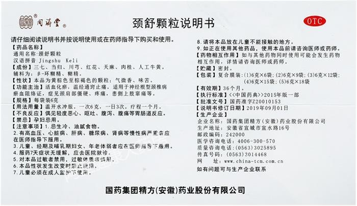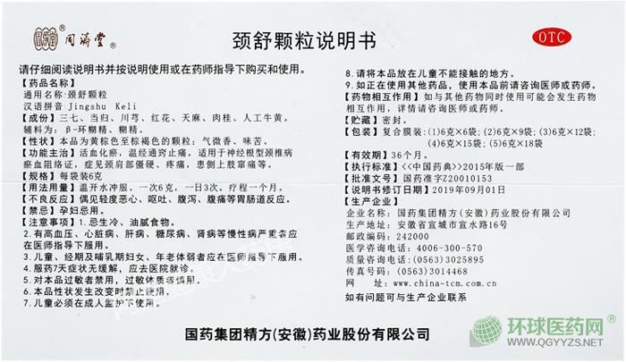 中成藥、OTC甲類、醫(yī)保甲類;钛,溫經(jīng)通竅止痛。適用于神經(jīng)根型頸椎病瘀血阻絡(luò)證,癥見頸肩部僵硬、疼痛,患側(cè)上肢竄痛等。國藥集團精方(安徽)藥業(yè)股份有限公司生產(chǎn)。貴州同濟堂制藥有限公司在環(huán)球醫(yī)藥網(wǎng)招商。【藥品名稱】通用名稱:頸舒顆粒