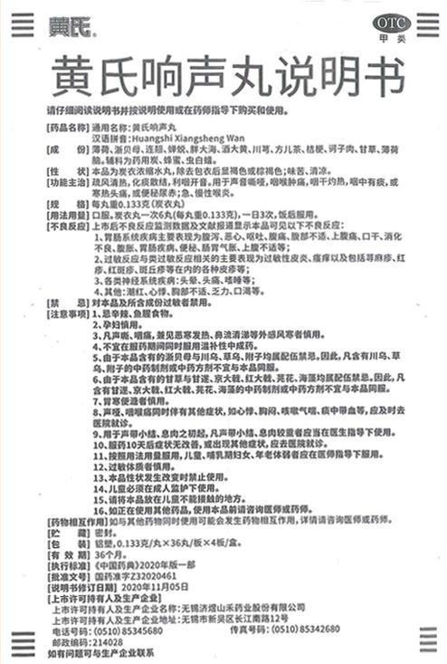 中成藥、OTC甲類、醫(yī)保甲類。疏風(fēng)清熱,化痰散結(jié),利咽開音。用于聲音嘶啞,咽喉腫痛,咽干灼熱,咽中有痰,或寒熱頭痛,或便秘尿赤;急、慢性喉炎。由無錫濟煜山禾藥業(yè)股份有限公司生產(chǎn)。目前在環(huán)球醫(yī)藥網(wǎng)招商。【藥品名稱】通用名稱:黃氏響聲丸