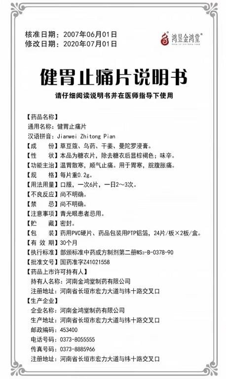 - 本頁面信息僅供參考,請以產品實際附帶說明書為準。 金鴻堂 健胃止痛片 說明書文字版 【藥品名稱】通用名稱:健胃止痛片 【成份】
