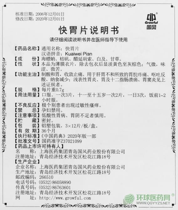 - 本頁(yè)面信息僅供參考,請(qǐng)以產(chǎn)品實(shí)際附帶說明書為準(zhǔn)。 上海醫(yī)藥國(guó)風(fēng)快胃片 包裝 上海醫(yī)藥國(guó)風(fēng)快胃片說明書 【藥品名
