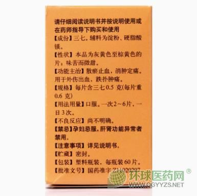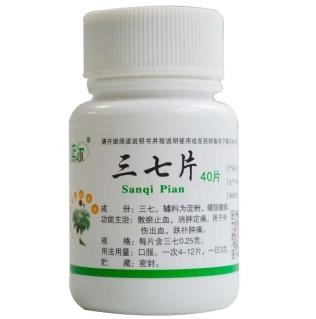 中成藥、OTC甲類、醫(yī)保甲類。散瘀止血,消腫定痛。用于外傷出血,跌撲腫痛。多家企業(yè)生產(chǎn)。目前湖北美寶藥業(yè)股份有限公司、湖北濟安堂藥業(yè)股份有限公司在環(huán)球醫(yī)藥網(wǎng)招商。【藥品名稱】通用名稱:三七片