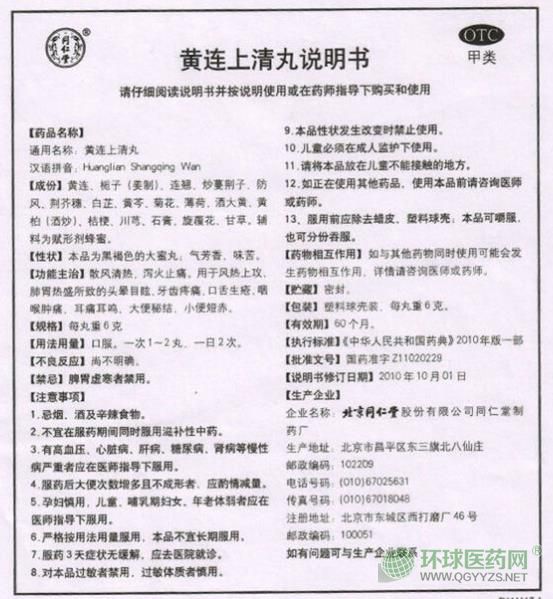 - 本頁(yè)面信息僅供參考,請(qǐng)以產(chǎn)品實(shí)際附帶說(shuō)明書為準(zhǔn)。 同仁堂黃連上清丸 說(shuō)明書文字版 【藥品名稱】 通用名稱:黃連上清丸 商品