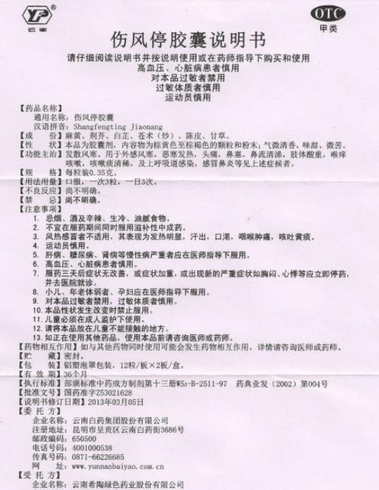 - 本頁面信息僅供參考,請(qǐng)以產(chǎn)品實(shí)際附帶說明書為準(zhǔn)。 云南白藥 云豐牌傷風(fēng)停膠囊 外包裝 云南白藥 云豐牌傷風(fēng)停膠