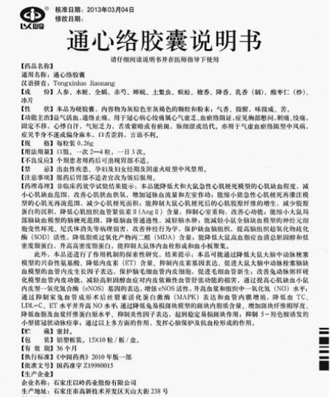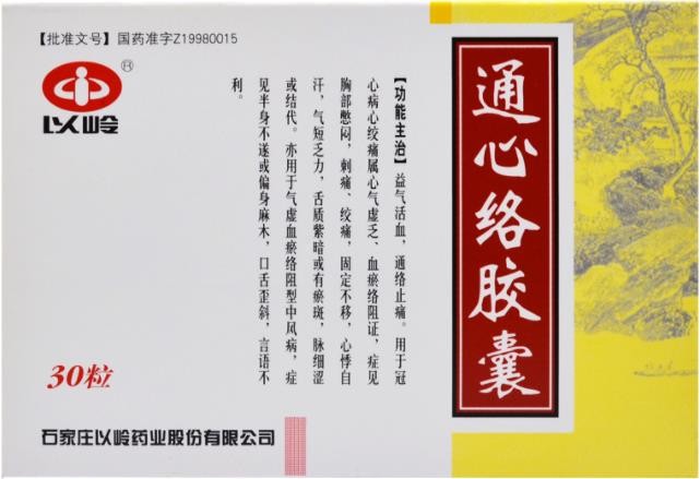 中成藥、處方藥、醫(yī)保甲類。益氣活血,通絡(luò)止痛。用于冠心病心絞痛證屬心氣虛乏、血瘀絡(luò)阻者。癥見胸部憋悶,刺痛、絞痛,固定不移,心悸自汗,氣短乏力,舌質(zhì)紫暗或有瘀斑,脈細(xì)澀或結(jié)代。亦用于腦梗塞恢復(fù)期,證屬中風(fēng)中經(jīng)絡(luò),氣虛血瘀絡(luò)阻型。癥見半身不遂,偏身麻木,口舌歪斜,言語(yǔ)不利等癥。由石家莊以嶺藥業(yè)股份有限公司生產(chǎn)。目前在環(huán)球醫(yī)藥網(wǎng)招商。【藥品名稱】通用名稱:通心絡(luò)膠囊