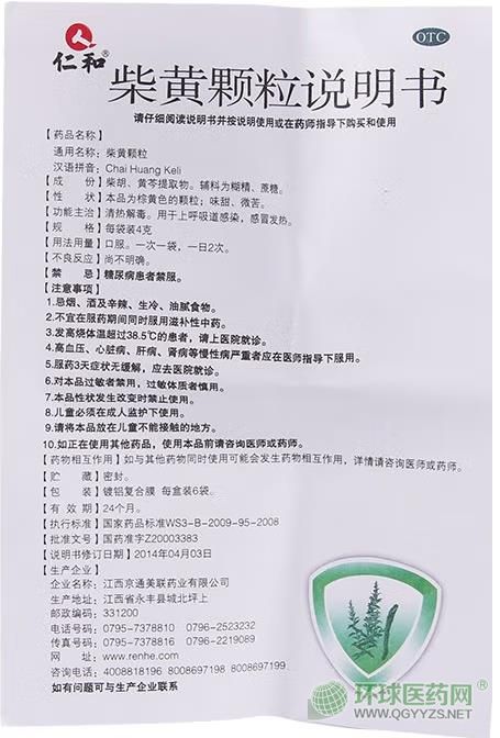 - 本頁(yè)面信息僅供參考,請(qǐng)以產(chǎn)品實(shí)際附帶說明書為準(zhǔn)。 仁和 柴黃顆粒 外包裝 仁和柴黃顆粒說明書(2014版) [藥品名稱]