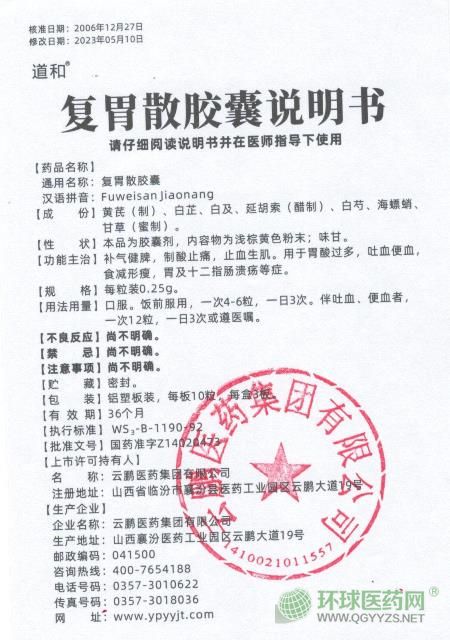 - 本頁(yè)面信息僅供參考,請(qǐng)以產(chǎn)品實(shí)際附帶說(shuō)明書(shū)為準(zhǔn)。 道和 復(fù)胃散膠囊 說(shuō)明書(shū)文字版 【藥品名稱】通用名稱:復(fù)胃散膠囊 漢語(yǔ)拼音:F