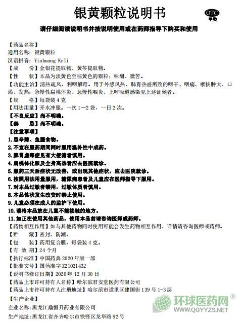 - 本頁(yè)面信息僅供參考,請(qǐng)以產(chǎn)品實(shí)際附帶說(shuō)明書(shū)為準(zhǔn)。 鼎恒升銀黃顆粒 說(shuō)明書(shū)文字版 【藥品名稱(chēng)】 通用名稱(chēng):銀黃顆粒 漢語(yǔ)拼音