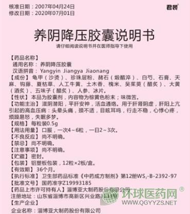 - 本頁面信息僅供參考,請以產(chǎn)品實際附帶說明書為準。 君裝 養(yǎng)陰降壓膠囊 說明書文字版 【藥品名稱】 通用名稱: 養(yǎng)陰降壓膠囊 漢
