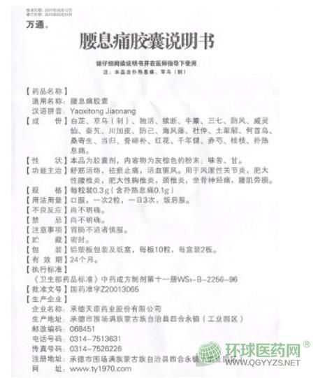中成藥、處方藥、非醫(yī)保。舒筋活絡(luò),祛瘀止痛,活血驅(qū)風(fēng)。用于風(fēng)濕性關(guān)節(jié)炎,肥大性腰椎炎,肥大性胸椎炎,頸椎炎,坐骨神經(jīng)痛,腰肌勞損。由多家企業(yè)生產(chǎn)。廣東恒誠制藥股份有限公司、吉林省百源康醫(yī)藥有限公司、盛瑞藥業(yè)集團等數(shù)十家公司在環(huán)球醫(yī)藥網(wǎng)招商【藥品名稱】通用名稱:腰息痛膠囊