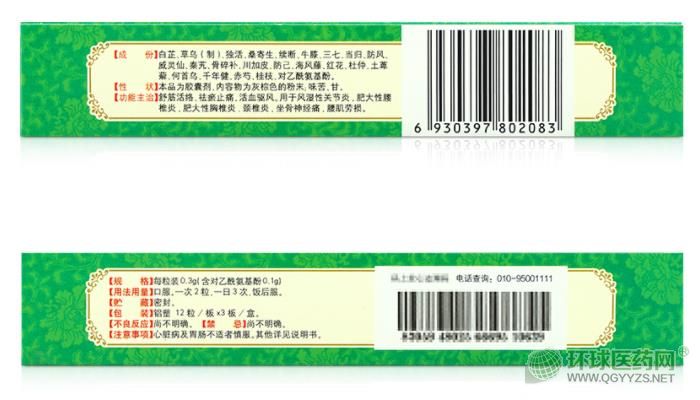 【成份】白芷 草烏 獨活 續(xù)斷 牛膝 三七 防風(fēng) 威靈仙 秦艽 川加皮 防己 海風(fēng)藤 杜仲 土萆解 何首烏 桑寄生 當(dāng)歸 骨碎補 紅花 千年健 赤芍 桂枝 撲熱息痛