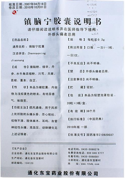 - 本頁(yè)面信息僅供參考,請(qǐng)以產(chǎn)品實(shí)際附帶說(shuō)明書為準(zhǔn)。 東寶鎮(zhèn)腦寧膠囊 外包裝 東寶鎮(zhèn)腦寧膠囊 說(shuō)明書(2010年版)