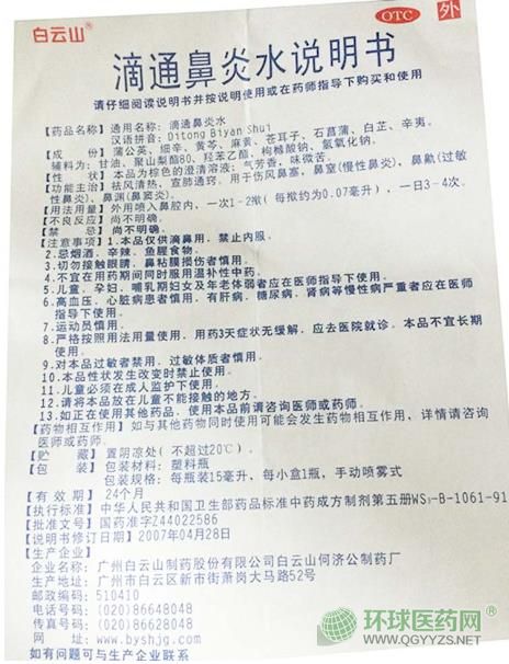 - 本頁面信息僅供參考,請以產(chǎn)品實際附帶說明書為準。 白云山 滴通鼻炎水 說明書文字版 【藥品名稱】 滴通鼻炎水(白云山) 【通用名