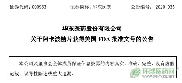 - 華東醫(yī)藥阿卡波糖片獲得美國(guó) FDA 批準(zhǔn)文