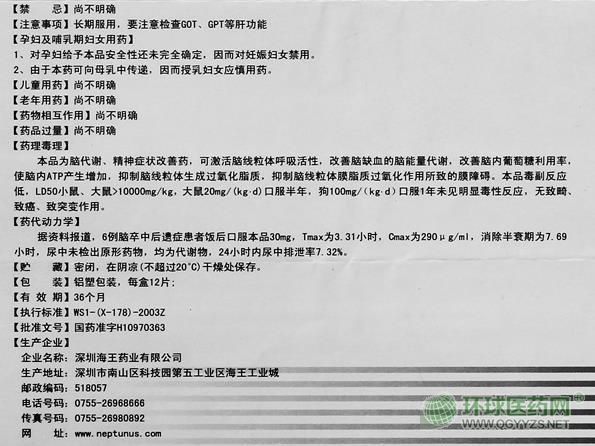 【藥理】本品為腦代謝、精神癥狀改善藥,可激活腦線粒體呼吸活性,改善腦缺血的腦能量代謝,改善腦內(nèi)葡萄糖利用率,使腦內(nèi)ATP產(chǎn)生增加,抑制腦線粒體生成過氧化脂質(zhì),抑制腦線粒體膜脂質(zhì)過氧化作用所致的膜障礙。本品毒副反應(yīng)低,LD50小鼠、大鼠10000mg/kg,大鼠20mg/(kg?d)口服半年,狗100mg/(kg?d)口服1年未見明顯毒性反應(yīng),無致畸、致癌、致突變作用。
