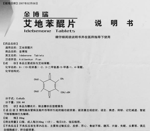 西藥、處方藥、非醫(yī)保。適應(yīng)癥:慢性腦血管病及腦外傷等所引起的腦功能損害。能改善主觀癥狀、語言、焦慮、抑郁、記憶減退、智能下降等精神行為障礙。由齊魯制藥有限公司(國藥準(zhǔn)字H10970137)、深圳海王藥業(yè)有限公司(國藥準(zhǔn)字H10970363)生產(chǎn)。【藥品名稱】通用名稱:艾地苯醌片