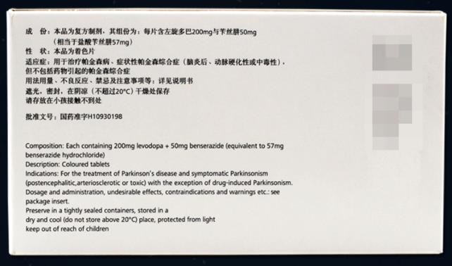 【成份】本品為復(fù)方制劑,其組份為:每片含左旋多巴200mg與芐絲胼50mg(相當(dāng)于鹽酸芐絲肼57mg)。