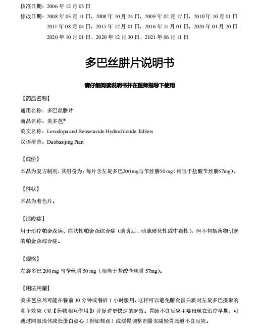 - 本頁面信息僅供參考,請以產(chǎn)品實際附帶說明書為準(zhǔn)。 羅氏美多芭多巴絲肼片說明書圖片版