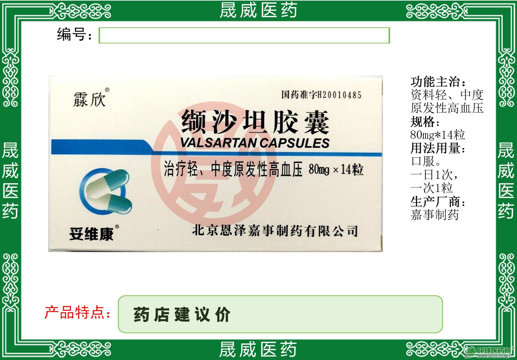 纈沙坦是一種口服有效的特異性的血管緊張素Ⅱ(AT1)受體提起拮抗劑,它選擇性地作用于AT1受體亞型,阻斷AngⅡ與AT1受體的結(jié)合(其特異性拮抗AT1受體的作用大于AT2受體約20,000倍),從而抑制血管收縮和醛固酮的釋放,產(chǎn)生降壓作用。該品不作用于血管緊張素轉(zhuǎn)換酶(ACE)、腎素和其它受體,不抑制與血壓和鈉平衡有關(guān)的離子通道;該品對血管緊張素轉(zhuǎn)換酶沒有抑制作用,不影響體內(nèi)緩激肽水平,因而導(dǎo)致咳嗽的副作用少于血管緊張素轉(zhuǎn)換酶抑制劑。 纈沙坦降低升高的血壓,同時不影響心律!Υ蠖鄶(shù)患者,單劑口服2小時內(nèi)產(chǎn)生降壓效果,4-6小時達(dá)作用高峰,降壓效果維持至服藥后24小時以上,治療2-4周后達(dá)最大降壓療效,并在長期治療期間保持療效。與噻嗪類利尿劑合用可進(jìn)一步增強(qiáng)降壓效果!⊥蝗唤K止纈沙坦治療,不引起高血壓“反跳”或其他副作用!±i沙坦不影響高血壓患者的總膽固醇、甘油三酯、血糖和尿酸水平。