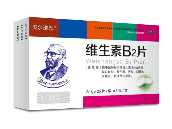 維生素B2(化學(xué)式:C17H20N4O6,式量376.37)又叫核黃素,微溶于水,在中性或酸性溶液中加熱是穩(wěn)定的。為體內(nèi)黃酶類輔基的組成部分(黃酶在生物氧化還原中發(fā)揮遞氫作用),當(dāng)缺乏時,就影響機(jī)體的生物氧化,使代謝發(fā)生障礙。其病變多表現(xiàn)為口、眼和外生殖器部位的炎癥,如口角炎、唇炎、舌炎、眼結(jié)膜炎和陰囊炎等,故本品可用于上述疾病的防治。體內(nèi)維生素B2的儲存是很有限的,因此每天都要由飲食提供。維生素B2的兩個性質(zhì)是造成其損失的主要原因:(1)可被光破壞;(2)在堿溶液中加熱可被破壞。