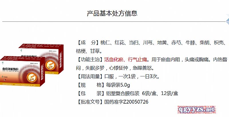 活血化瘀,行氣止痛。用于瘀血內(nèi)阻,頭痛或胸痛,內(nèi)熱瞀悶,失眠多夢,心悸怔忡,急躁善怒。