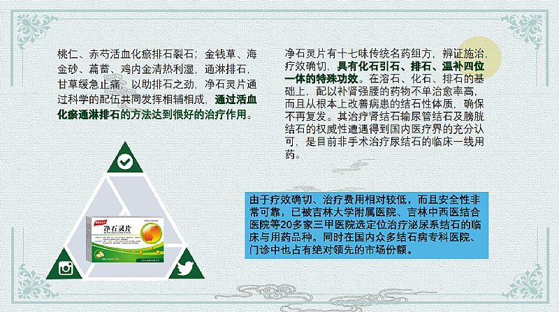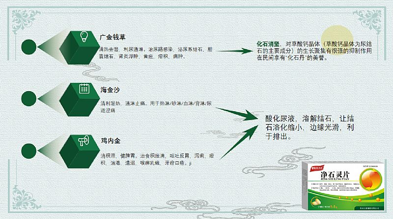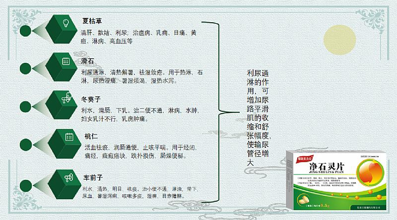 | 作用機理 | 桃仁、赤芍活血化瘀排石裂石; 金錢草、海金砂、萹蓄、雞內(nèi)金清熱利濕,通淋排石; 甘草緩急止痛,以助排石 凈石靈片通過科學(xué)的配伍共同發(fā)揮相輔相成,通過活血化瘀通淋排石的方法達到很好的治療作用。 |