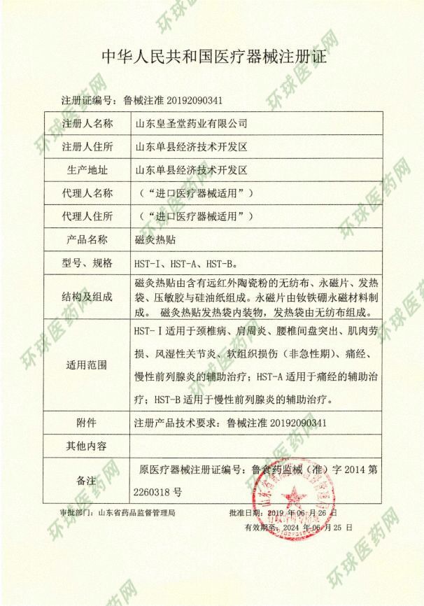 | 補(bǔ)充說明 | 皇圣堂磁灸熱貼及磁療、灸療、熱療與藥療于一體,全方位改善血液微循環(huán)、活血化瘀,五盒一療程,是臨床上常用的一次性醫(yī)保耗材。 |