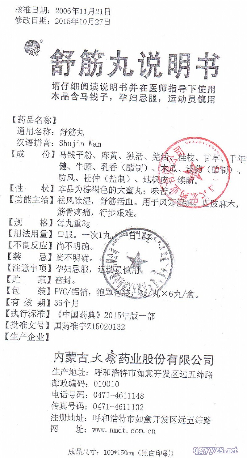 | 補充說明 | 舒筋丸用法用量口服,一次1丸,一日1次,患者必須嚴格按規(guī)定劑量服用舒筋丸,應(yīng)在醫(yī)師指導(dǎo)下使用;颊咭欢ǖ米⒁猓罕酒泛瑒《荆瑧(yīng)按量服用,不能多服;如正在服用其他藥品,使用本品前請咨詢醫(yī)師或藥師。此外,如與其他藥物同時使用可能會發(fā)生藥物相互作用,詳情請咨詢醫(yī)師。 |