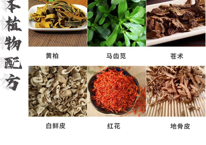 | 主要成分 | 烏梢蛇、蝮蛇、苦參、黃柏、大黃、馬齒莧、蒼術、防風、白鮮皮、紅花、地骨皮、地榆,白芷、五加皮、蒼耳子、蒺藜、蛇床子、大皂角、魚腥草、土茯苓、牛膝、石榴皮、冰片、醋酸氯已定。 |