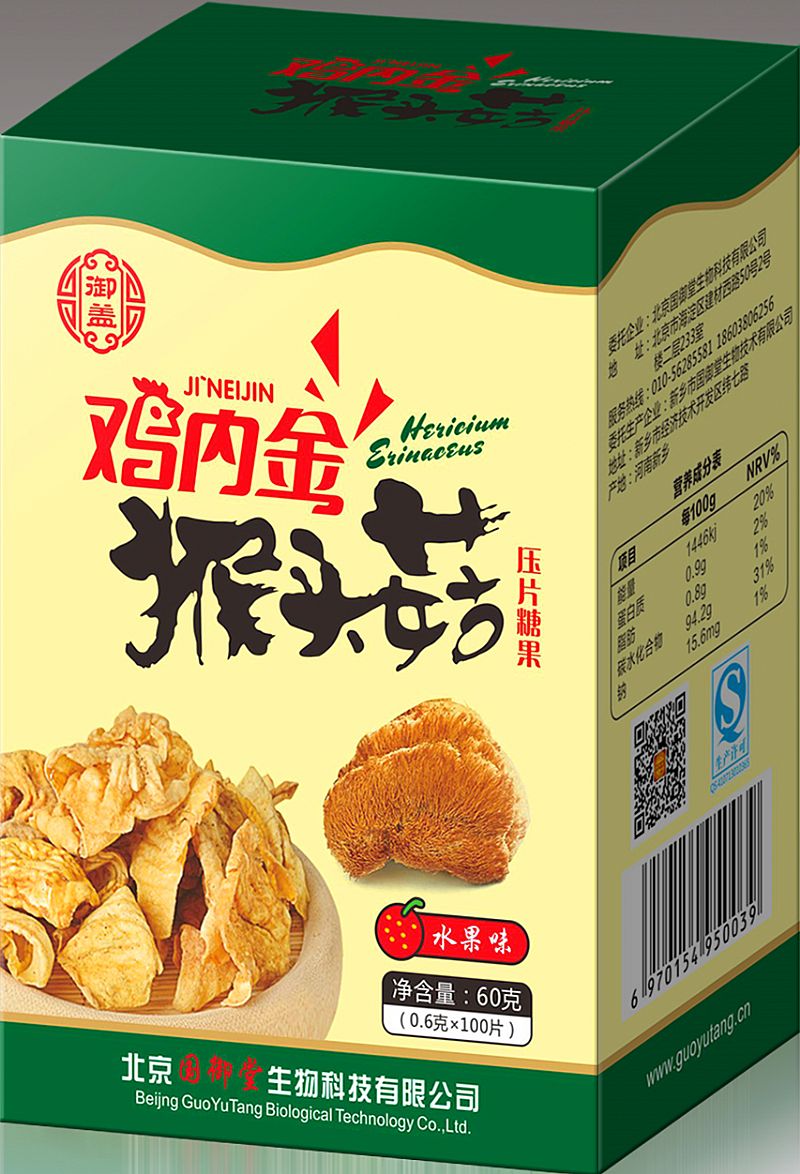 | 補充說明 | 雞內(nèi)金猴頭菇 咀嚼型 雞內(nèi)金、猴頭菇都是藥食同源原料 規(guī)格:100片/盒,200盒/件 |