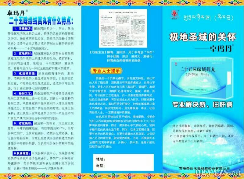 | 功能主治 | 作用:解毒,清肝熱。用于中毒及"木布"降于膽腑,肝熱、肝腫大、肝硬化、肝胃瘀血疼痛等新舊肝病。 |