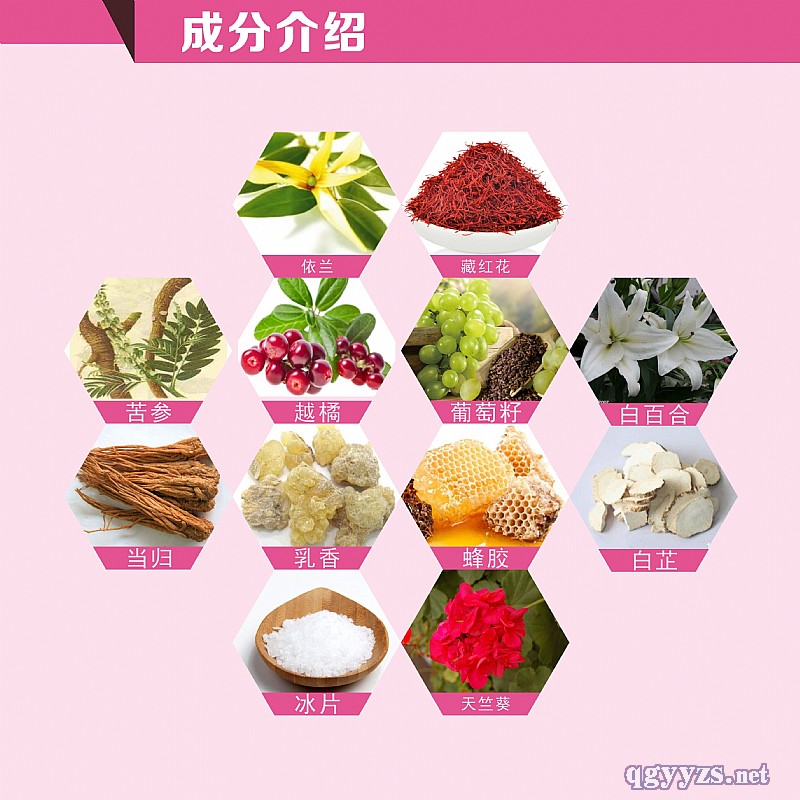 | 主要成分 | 依蘭、藏紅花、天竺葵、苦參、越橘、葡萄籽、白百合、當(dāng)歸、乳香、蜂膠、白芷、冰片等 |