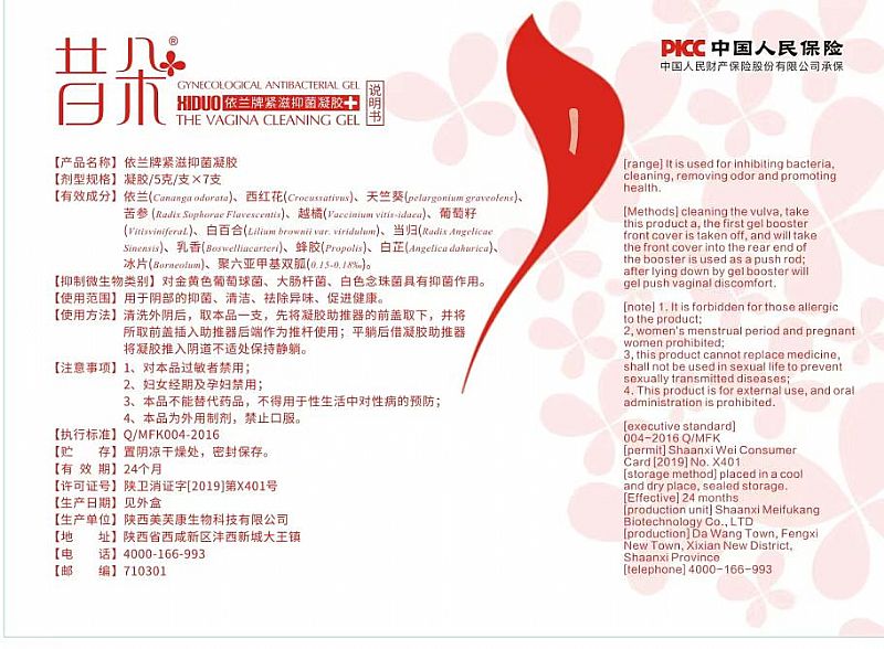 | 使用方法 | 清洗外陰后,取本品一支,先將凝膠助推器的前蓋取下,并將所取前蓋插入助推器后端作為推桿枝用;平躺后借凝膠助推器將凝膠推入陰道不適處,靜躺保持三分鐘。每日1-2次。 |