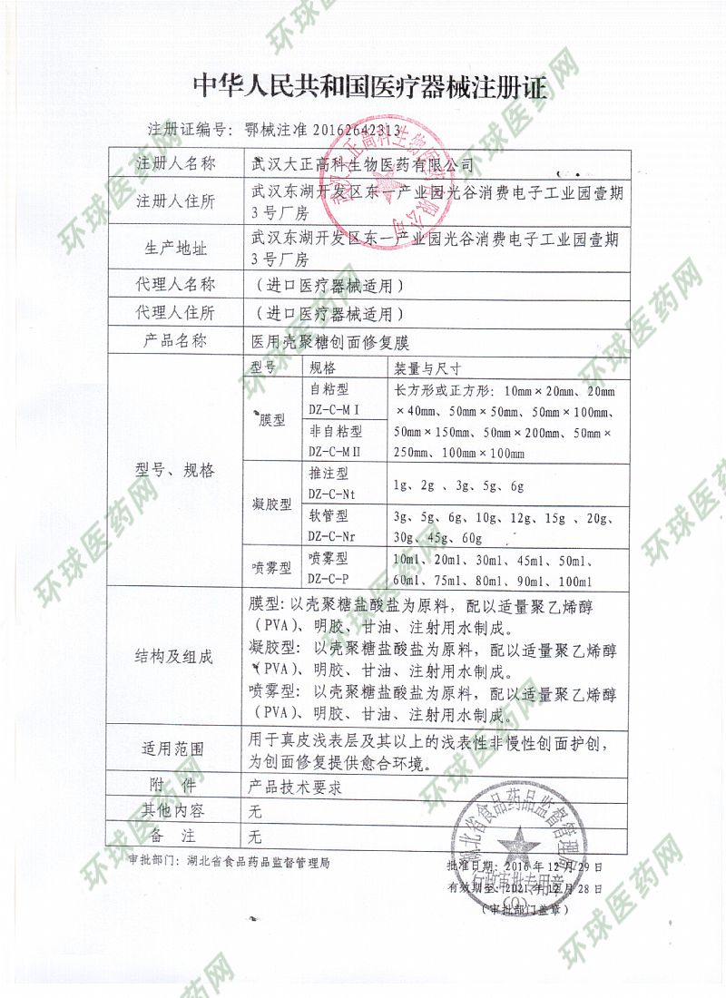 | 主要成分 | 以殼聚糖為主要材料,配以適量聚乙烯醇(PVA)、明膠等制成。其中殼聚糖質(zhì)量濃度≥1.0 |