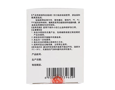 | 補(bǔ)充說明 | 優(yōu)勢:創(chuàng)可貼能夠壓迫止血、保護(hù)創(chuàng)面、預(yù)防感染、促進(jìn)愈合,同時,又具有體積小、使用簡單、攜帶方便等優(yōu)點(diǎn)。 注意事項(xiàng) 本品為密封的無菌產(chǎn)品,包裝破損或超過有效期的產(chǎn)品勿使用。 拆封后忌用手接觸中間滲血期。 |