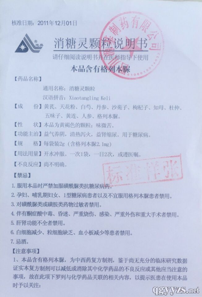 | 補(bǔ)充說明 | 黃芪、天花粉、白芍、丹參、沙苑子、知母、杜仲、五味子、黃連、人參、格列本脲 本品為黃褐色顆粒,味微苦。 |