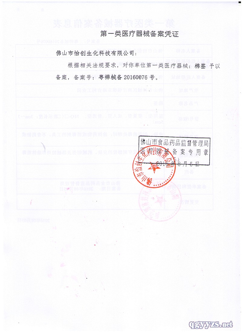 | 補(bǔ)充說明 | 【醫(yī)療器械生產(chǎn)企業(yè)備案憑證編號】 粵禪食藥監(jiān)械生產(chǎn)備20150023號 【產(chǎn)品備案號】粵禪械備20160076號 【技術(shù)要求編號】粵禪械備20160076號 【主要結(jié)構(gòu)】棉簽采用醫(yī)用脫脂棉及竹棒或(紙棒、木棒、塑料棒)制成。 【產(chǎn)品描述】皮膚、創(chuàng)面消毒處理時,涂抹藥物或消毒劑的工具。 【適用范圍】棉簽用于對手術(shù)或穿刺部位的皮膚、機(jī)械創(chuàng)傷及器械的局部涂抹消毒劑。 【禁忌癥、注意事項(xiàng)、警示及提示性說明】 1 棉簽為一次性使用,不允許重復(fù)使用。 2 使用前檢查包裝,包裝破損禁止直接使用。 【特殊儲存條件和方法】 包裝后的棉簽應(yīng)貯存在通風(fēng)、干燥、陰涼、遠(yuǎn)離熱源、無腐蝕性氣體的室內(nèi)。 運(yùn)輸中應(yīng)防潮、避免光照、遠(yuǎn)離熱源。 【生產(chǎn)企業(yè)名稱】佛山市怡創(chuàng)生化科技有限公司 【注冊地址】佛山市禪城區(qū)南莊鎮(zhèn)樵樂路吉利工業(yè)園 【生產(chǎn)地址】佛山市禪城區(qū)南莊鎮(zhèn)樵樂路吉利工業(yè)園 |