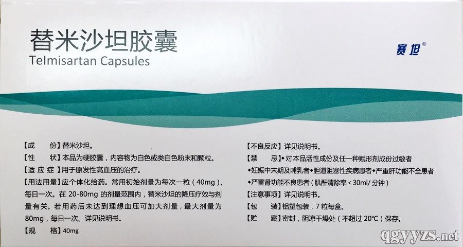 成人:應(yīng)個體化給藥。常用初始劑量為每次一粒(40mg),每日一次。在20~80mg的劑量范圍內(nèi),替米沙坦的降壓療效與劑量有關(guān)。若用藥后未達到理想血壓可加大劑量,最大劑量為80mg(即2粒膠囊),每日一次。本品可與噻嗪類利尿藥如氫氯噻嗪合用,此類利尿藥與本品有協(xié)同降壓作用。因替米沙坦在療程開始后四至八周本品才能發(fā)揮最大藥效,因此若欲加大藥物劑量時,應(yīng)對此予以考慮。腎功能不全的病人輕度或中度腎功能不良的病人,服用本品不需調(diào)整劑量。替米沙坦不通過血過濾消除。肝功能不全的病人輕或中度肝功能不全的病人,本品用量每日不應(yīng)超過40mg。老年人服用本品不需要調(diào)整劑量。兒童和青少年對于兒童和18歲以下的青少年,本品的安全性和有效性數(shù)據(jù)尚未建立。