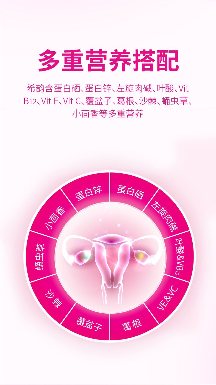 | 主要成分 | 蛋白鋅硒、左旋肉堿、枸杞子、桑椹、葛根、覆盆子、沙棘、蛹蟲草、甜羅勒、山楂、玫瑰花(重瓣紅玫瑰)、小茴香、雨生紅球藻微囊粉、葉酸、維生素C、維生素D3、維生素E、維生素B1、維生素B2、維生素B6、維生素B12 |