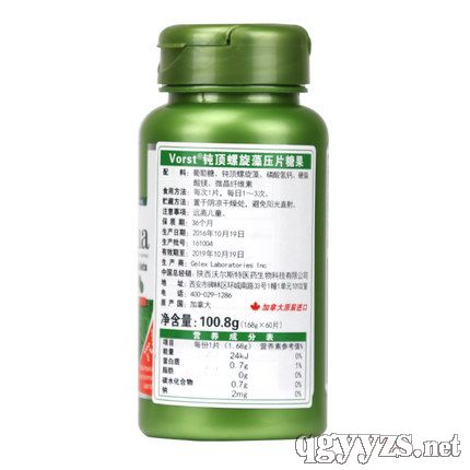 | 補(bǔ)充說(shuō)明 | VORST維爾適螺旋藻壓片糖果 優(yōu)選臻品鈍頂螺旋藻,搜腸刮肚,上下皆通 產(chǎn)品信息: 原 產(chǎn) 地:加拿大 包裝含量:1.5g/片×60片/瓶 成分含量:鈍頂螺旋藻1000mg/片 服用須知: 1.嚼服,1片/次,1—3次/天。 2.孕婦及哺乳期女性不宜服用。 3.減脂人群,飯前半小時(shí)服用。 4.甲狀腺疾病人群,請(qǐng)慎服。 產(chǎn)品優(yōu)勢(shì) 1.優(yōu)選藻中珍品,鈍頂螺旋藻 螺旋藻中優(yōu)良的品種有兩種,鈍頂螺旋藻和極大螺旋藻。而鈍頂螺旋藻中,富含珍貴成分——藻藍(lán)蛋白,氨基酸構(gòu)成種類齊全,營(yíng)養(yǎng)豐富,而且利于吸收。本品采用鈍頂螺旋藻,遵循營(yíng)養(yǎng)科學(xué),萃取濃縮而成。 2.富含藻藍(lán)蛋白及多種營(yíng)養(yǎng) 螺旋藻中鈍頂螺旋藻的蛋白質(zhì)高,藻藍(lán)蛋白含量多,SOD活性高,可溶性蛋白量高,吸收效果好,同時(shí),鈍頂螺旋藻含有多種礦物元素,補(bǔ)充人體所需。 3.適合飲食偏油膩,出恭不暢的人群 飲食健康受餐廳廚師影響多過(guò)家庭的上班族,想要清淡而不得,油脂和能量超標(biāo)堆積,加上久坐,總覺(jué)得勒得緊,撐得難受。有人想要通過(guò)方便獲得片刻輕松亦不遂愿,戰(zhàn)況歷久彌堅(jiān)。每天兩粒螺旋藻片,應(yīng)能寬松順暢很多。 |