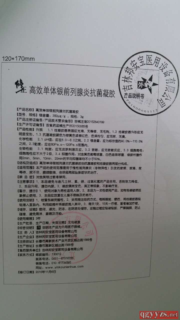 | 補(bǔ)充說明 | 型號(hào)、規(guī)格:銀含量:350μg/g;規(guī)格:3g 產(chǎn)品注冊(cè)證編號(hào)/產(chǎn)品技術(shù)要求編號(hào):吉械注準(zhǔn)20152640199 生產(chǎn)許可證編號(hào):吉食藥監(jiān)械生產(chǎn)許20152640199 產(chǎn)品性能:外觀 1.1給凝膠器表面應(yīng)光滑,無鋒棱、無毛刺。1.2給凝膠器外形應(yīng)無明顯變形。1.3抗菌凝膠顏色為棕黃色或棕紅色、色澤均勻、應(yīng)五味、無臭。 化學(xué)性能 2.1pH值:應(yīng)在6.0~8.0之間。2.2銀含量:應(yīng)為標(biāo)示值的90.0%~110.0%之間。2.3黏度:應(yīng)在80Pa.s~120Pa.s范圍內(nèi)。 生物性能 3.1刺激:應(yīng)無皮膚刺激反應(yīng)。3.2致敏:應(yīng)無致敏反應(yīng)。3.3細(xì)胞毒性:細(xì)胞毒性應(yīng)不大于2級(jí)。3.4抑菌作用:對(duì)金黃色葡萄球菌、白色念珠球菌、綠膿桿菌作用2min、5min、10min、20min的平均抑菌率均不小于50%。 禁忌癥:對(duì)金屬銀過敏者禁用 注意事項(xiàng):1、本品避免與含凡士林、氯、碘、過氧化氫的產(chǎn)品合用,否則效率降低。2、本品外用,請(qǐng)勿內(nèi)服。3凝膠偶有變色,屬正,F(xiàn)象,不影響療效。 警示、提示:1、適用對(duì)象為男性適用人群。2、本品為一次性使用產(chǎn)品,如有包裝破損現(xiàn)象禁止使用。3、本品應(yīng)放置在兒童不宜觸及的地方。 儲(chǔ)存、運(yùn)輸:密閉、避光、防凍,在陰涼處儲(chǔ)存。運(yùn)輸過程應(yīng)輕裝輕卸、嚴(yán)禁拋擲、防止碰撞、避免雨淋、爆嗮及污染。 使用期限:3年 注冊(cè)人:吉林邦安寶醫(yī)用設(shè)備有限公司 生產(chǎn)企業(yè):吉林邦安寶醫(yī)用設(shè)備有限公司 注冊(cè)地址:長春市高新技術(shù)產(chǎn)業(yè)開發(fā)區(qū)越達(dá)路1566號(hào) 生產(chǎn)地址:長春市高新區(qū)越達(dá)路1566號(hào) 售后服務(wù)單位:吉林邦安寶醫(yī)用設(shè)備有限公司 |