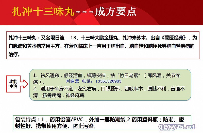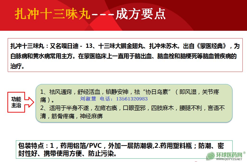 | 補充說明 | 扎沖十三味丸能有效的抑制血栓形成、溶解血栓。促進腦出血血腫吸收和受損受損的腦細胞恢復功能,使半身不遂、言語不利、口眼斜歪迅速康復。 扎沖十三味丸能軟化血管、降低血管阻力和血液粘稠凝聚狀態(tài),增加心腦供血,改善心腦慢性供血不足引起的眩暈、胸悶、頭痛等癥。 扎沖十三味丸可改善椎基底動脈缺血,使局部受壓的神經根細胞和粘連變性的肌肉組織松懈和修復?捎行Ь徑忸i椎病引起的**癥狀。 扎沖十三味丸改善機體微循環(huán),抑制WBC、肥大細胞和免疫復合物沉積于關節(jié)滑囊和血管壁上,因而對風濕、類風濕療效**。 |
