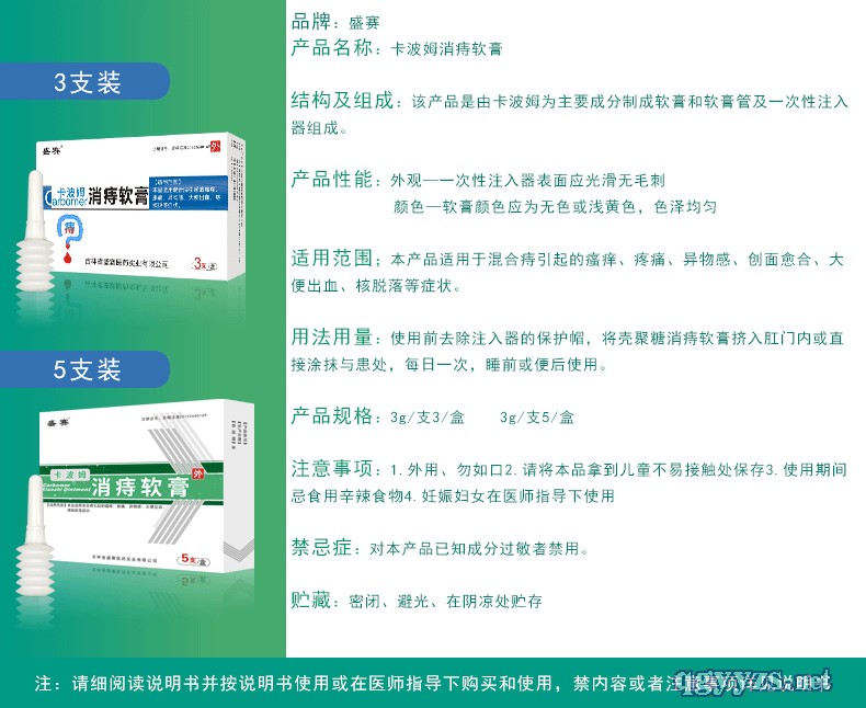 | 使用方法 | 使用前去除注入器保護帽,將卡波姆消痔軟膏擠入肛門內(nèi)或直接涂抹患處,每日一次,睡前或便后使用。 |