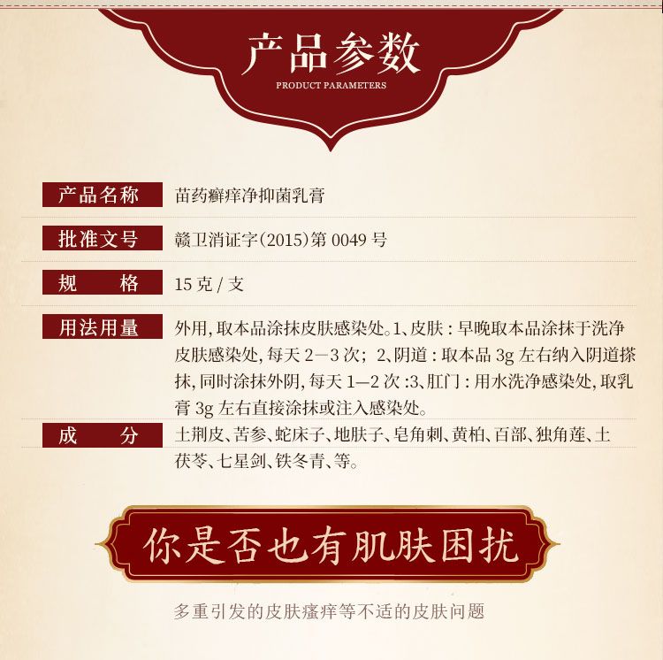 | 產品名稱 | 苗藥癬癢凈抑菌乳膏 |