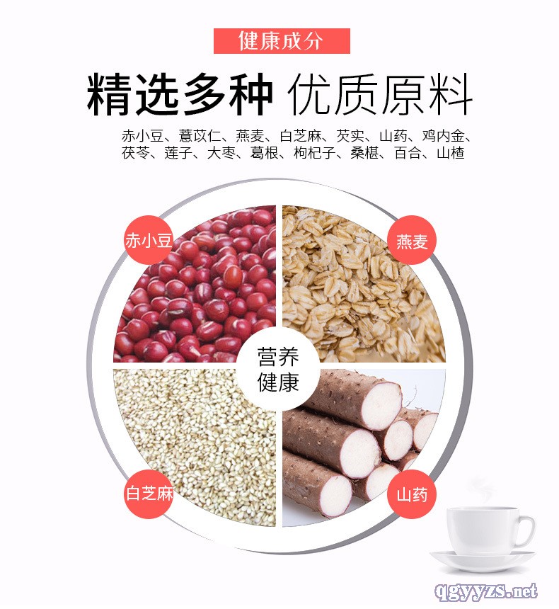 | 主要成分 | 赤小豆、薏苡仁、燕麥、白芝麻、芡實、山藥、雞內(nèi)金、茯苓、蓮子、大棗、葛根、枸杞子、桑椹、百合、山楂 |