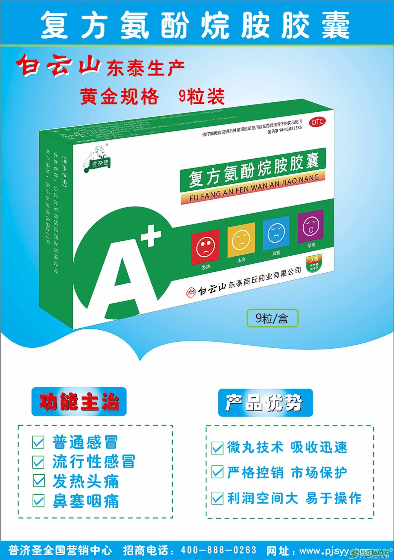 | 補(bǔ)充說明 | 1,微丸技術(shù)工藝,有利于提高生物利用度,減少對(duì)胃的刺激。 2,白云山(商丘)東泰制藥廠,老百姓信任度更高。 3,內(nèi)含對(duì)乙酰氨基酚,(解熱,鎮(zhèn)痛),金剛烷胺(可抗.亞一甲型流感病毒,可抑制病毒的繁殖),***(中樞性興奮藥,可以提高其他藥物療效,同時(shí)降低藥物所帶來的嗜睡,頭暈的)馬來酸氯苯那敏(抗過敏作用,可以減輕鼻塞,流涕,打噴嚏等癥狀),人工牛黃,解熱鎮(zhèn)驚的作用. 4,一盒9粒,一次一粒,一天兩次,4.5天用量。(為消費(fèi)者節(jié)省每一分錢,600盒一件) 5,全是新批號(hào),工藝先進(jìn),有效期是3年,比市面95%的廠家效期都長。 6,與原研單位工藝一樣,效果質(zhì)量有**。 7,廣告帶動(dòng),銷量自然不成問題。 8,企業(yè)積極的做一致性報(bào)告,無后顧換產(chǎn)品之憂,有利于長期合作。 |